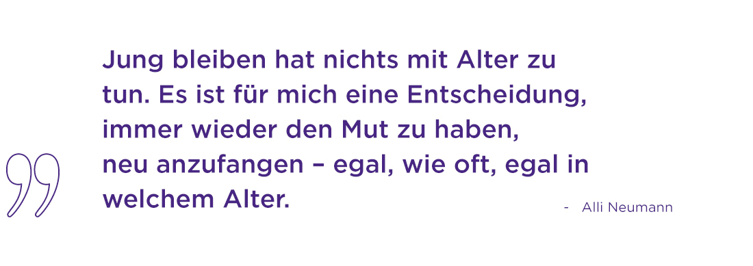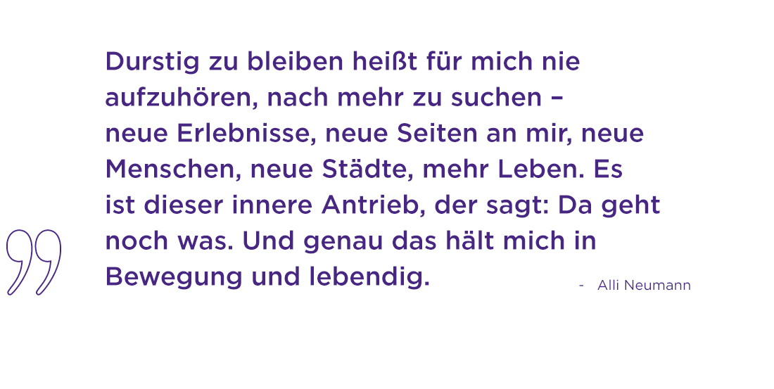 In einer Welt, die oft von Oberflächlichkeit geprägt ist, zeigt Alli Neumann, dass es möglich ist, erfolgreich zu sein, ohne sich selbst zu verlieren – und dass es sich lohnt, durstig zu bleiben: nach Echtheit, Kreativität und einer besseren Zukunft, in der wir alle #jungbleiben.